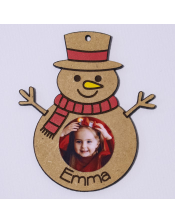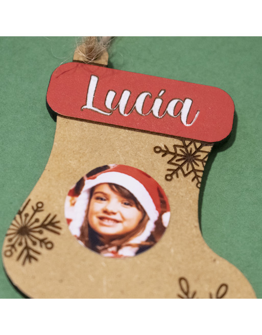 Bola navideña de madera DM grabada con foto en forma de calcetín, reno, regalo o muñeco de nieve.